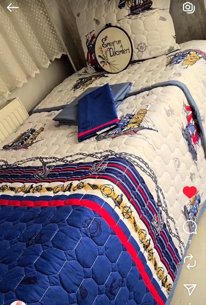 Lacivert renkte, deniz temalı gemi ve çapa desenleri bulunan çocuk yatak örtüsü. Yumuşak, kapitone dokusu ve uyumlu yastık kılıfları içerir. ️