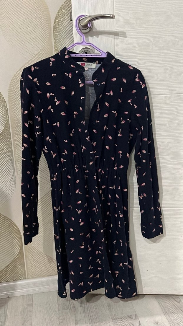 Lacivert baskılı, düğmeli ve V yaka elbise. Uzun kollu, bol kesim ve midi boyda, rahat sentetik kumaştan üretilmiştir. Kemeriyle beraber gönderilecektir