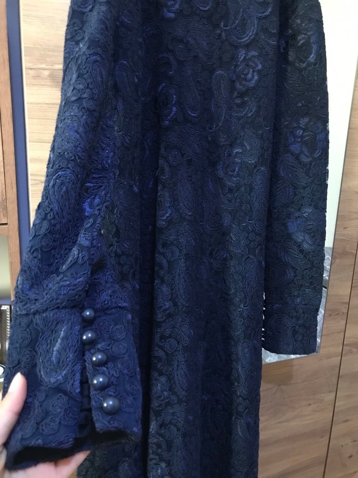 Lacivert desenli, düğmeli, uzun kol ve uzun boylu abiye .