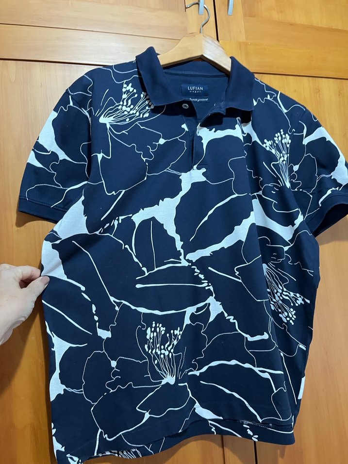 Lacivert renkte, büyük çiçek desenli, kısa kollu, düğmeli yakalı, bol kesim erkek lufian tişört. Günlük rahat kullanım için s kumaştan üretilmiştir.