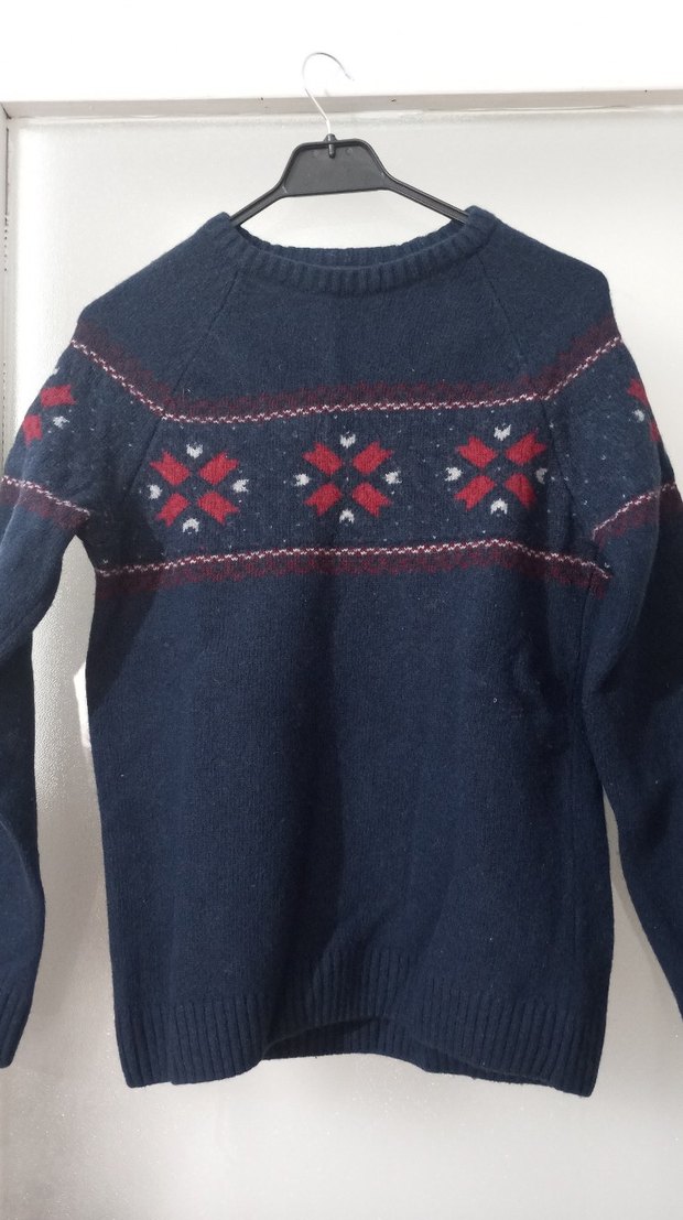 Lacivert renkli, uzun kollu, yuvarlak yaka triko kazak. Göğüs ve kollarda kırmızı-beyaz desen detayları bulunur, rahat ve sokak stiline uygundur.Ölçüleri kol altından en:47 cm boy:64 cm