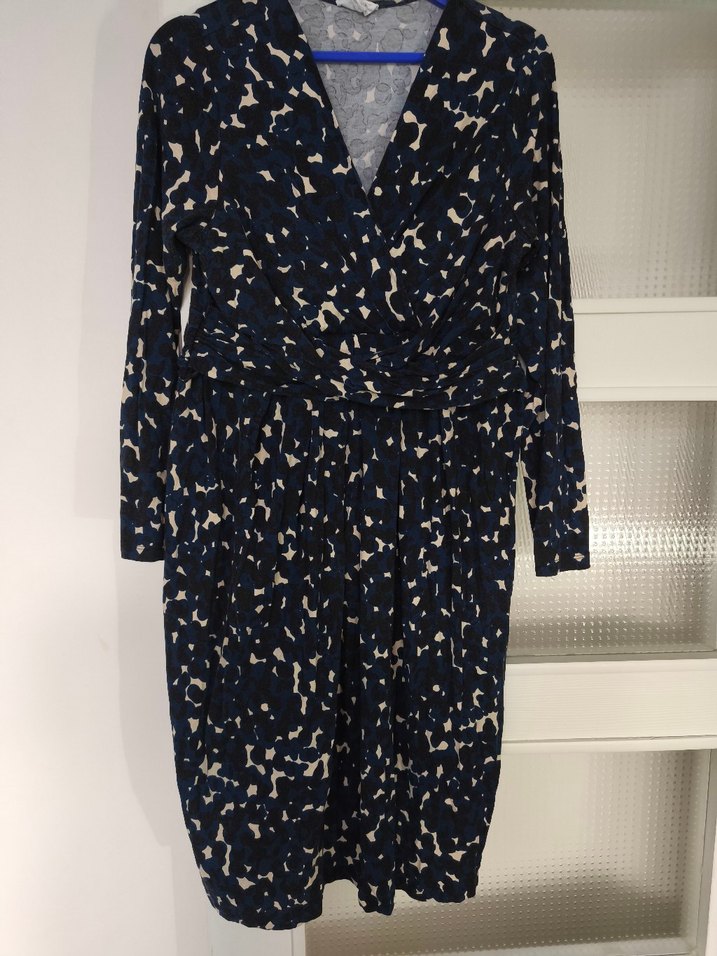 Lacivert renkte, uzun kollu, V yakalı, dökümlü hamile midi elbise. Rahat sentetik kumaştan, ofis kullanımı için uygun.