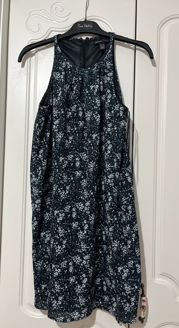 Yüksek yakalı, kolsuz ve drapeli detaylı bu midi elbise, sentetik kumaştan üretilmiş ve koyu gri tie-dye desenine sahip. Günlük kullanıma uygun.