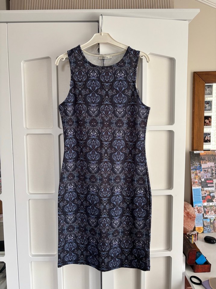 , yüksek yakalı, vücuda oturan lacivert mini elbise. Karanlık tie-dye deseni ve bohem tarzı ile ofis için uygun. Mandala desenli