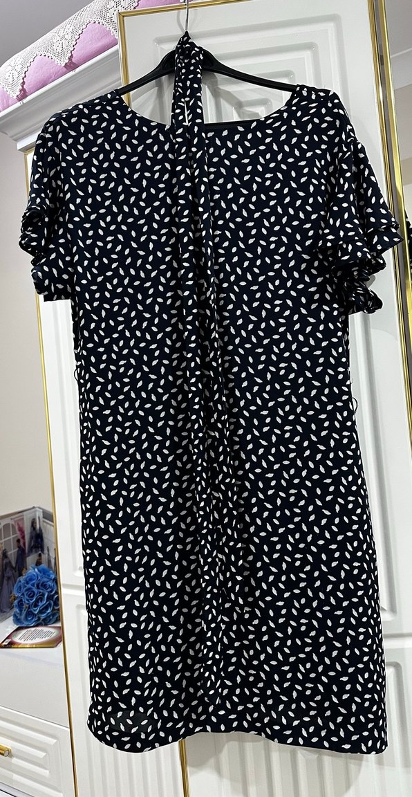 Lacıvert renkli, desenli, bol kesim ve V yakalı . Kısa kollarda volan detayı bulunur. Günlük kullanıma uygundur. Kemerlı
