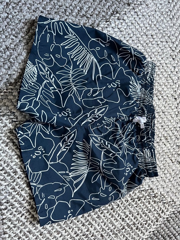 Lacivert renkli, bol kesim ve çiçek desenli erkek çocuk mayo şort. kısa boylu, rahat ve bohem sokak tarzı.
