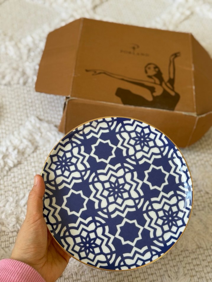 Altın kenarlı, lacivert geometrik desenli porselen tabak, yiyecek sunumu için uygundur. ️Morocco serisi porland