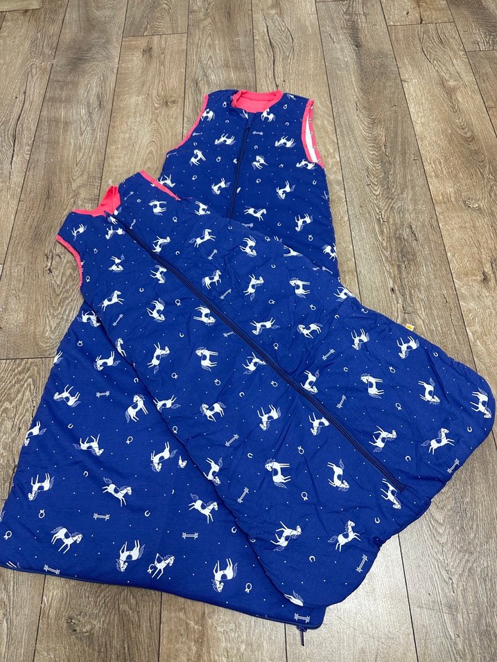 çocuklar için kolsuz, ön fermuarlı ve dar kesim lacivert uyku tulumu. Renkli at desenleri ve askısız yaka bulunur.