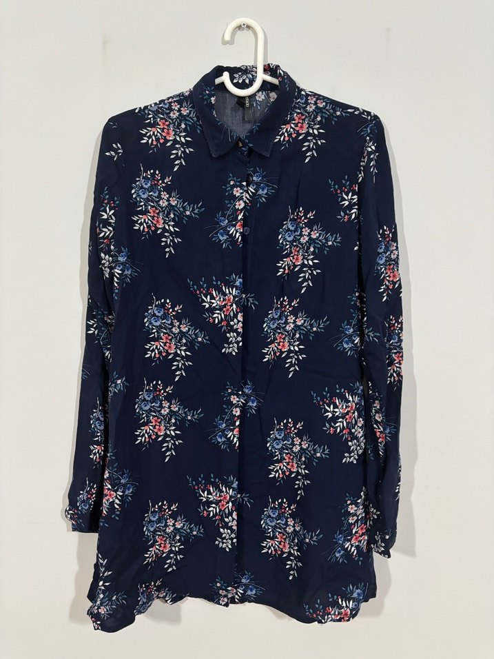 Lacivert uzun kollu kadın gömlek, yakalı ve düğmeli. Gevşek kesim, midi boy, koyu renkli çiçekli desenli, rahat kullanıma uygun.