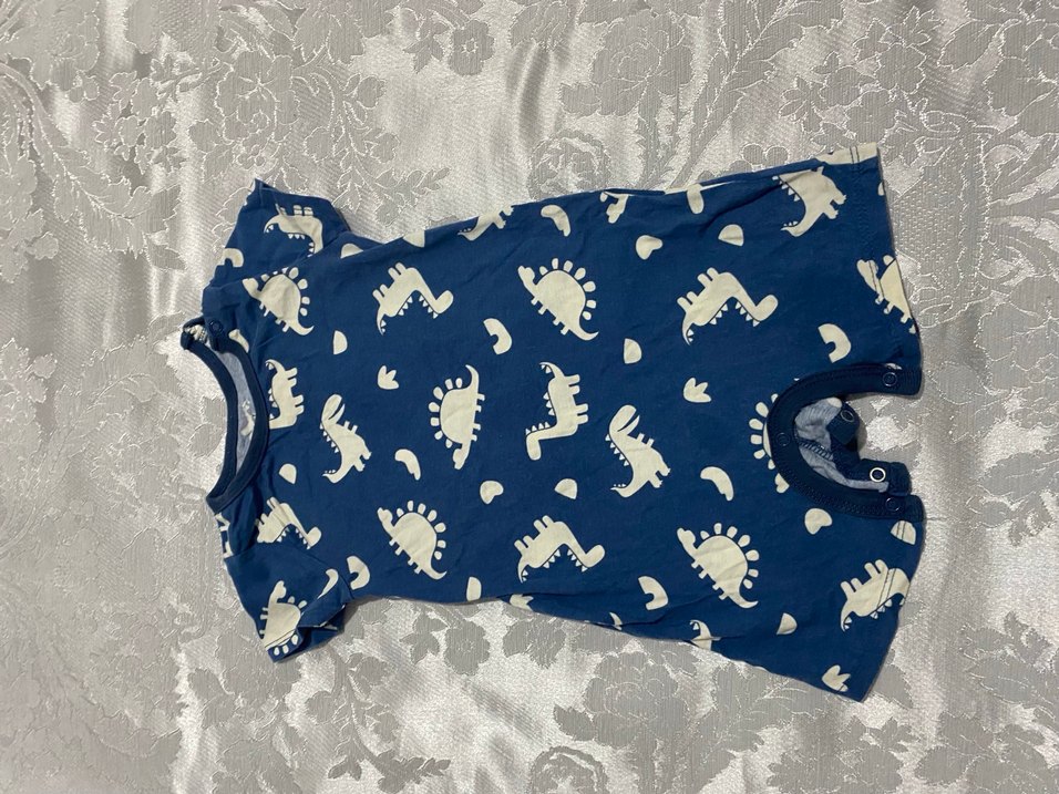 Lacivert renkli, kısa kollu, yuvarlak yakalı erkek bebek tulumu. Dinozor baskılı ve dantel detaylı, yumuşak sentetik kumaştan yapılmıştır.