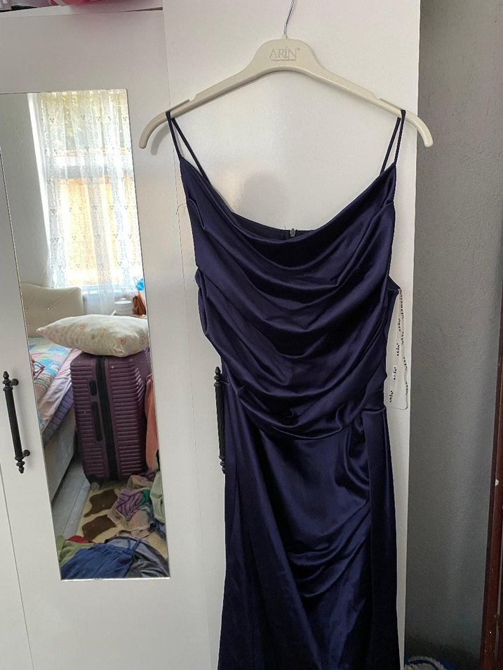 Lacivert, drapeli tasarıma sahip, askılı V yakalı ve vücuda oturan abiye elbise. Gotik Paris tarzıyla romantik buluşmalar için ideal. 38 beden ama esnek yapısı var