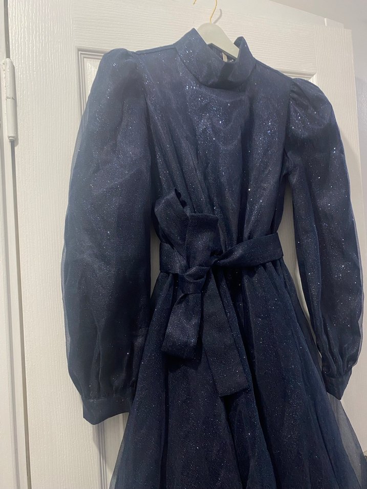 Lacivert uzun abiye elbise, yüksek yakalı ve uzun kolludur. Drapeli tasarım ve bağcıklı kemerle gotik ve avangart tarzda düğün için uygundur. ✨