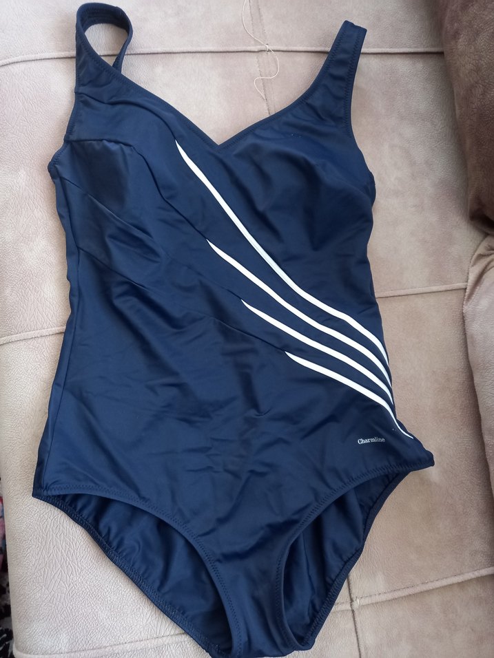 Sırtı ince bantlı, drapeli ve beyaz çapraz çizgili lacivert kadın mayo, plaj için uygun.38bn