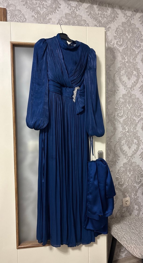 Lacivert renkte, drapeli ve uzun kollu bol kesim abiye elbise. Çentikli yaka ve belde süs detayı ile vintage ve modern klasik tarzda, düğün için uygun.Şalıyla birlikte gönderiyorum..
