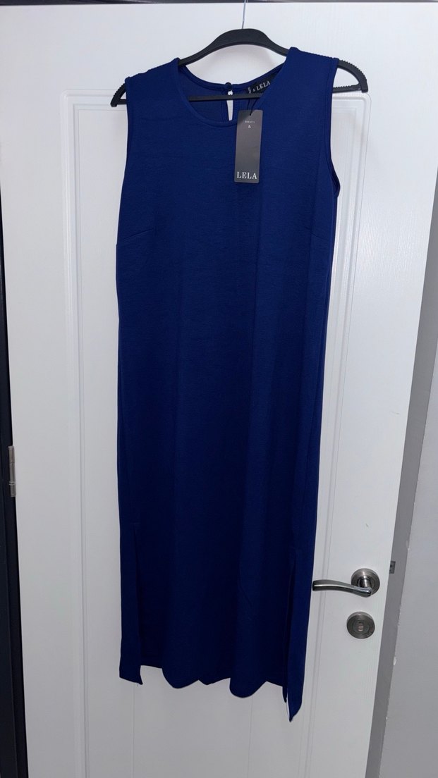 Lacivert renkte, kolsuz, yuvarlak yaka ve drapeli uzun elbise. Regular fit kesime sahip, minimalist ve sade tasarım ofis için uygundur. Sentetik kumaştan üretilmiştir.