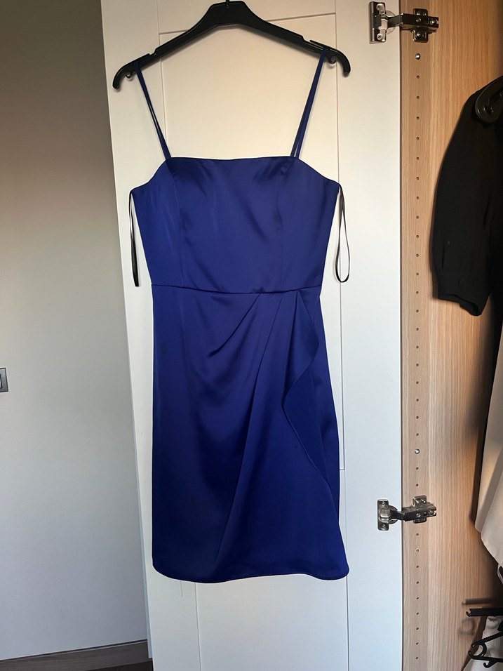 Lacivert, drapeli, ince askılı ve straplez yaka detaylı midi boy abiye elbise. Minimalist ve çağdaş tasarımıyla romantik akşamlar için uygundur.