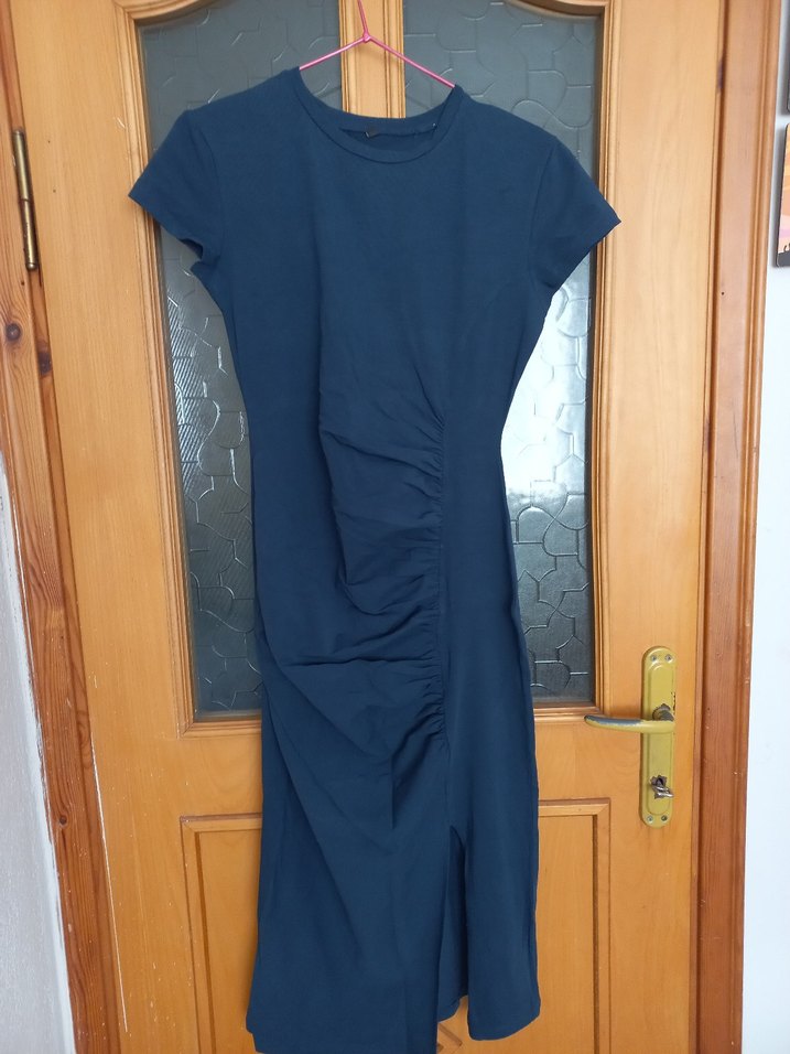Lacivert renkte, drapeli ve vücuda oturan kesime sahiptir. Kısa kollu, yuvarlak yakalı, yumuşak keten kumaştan midi boydadır.