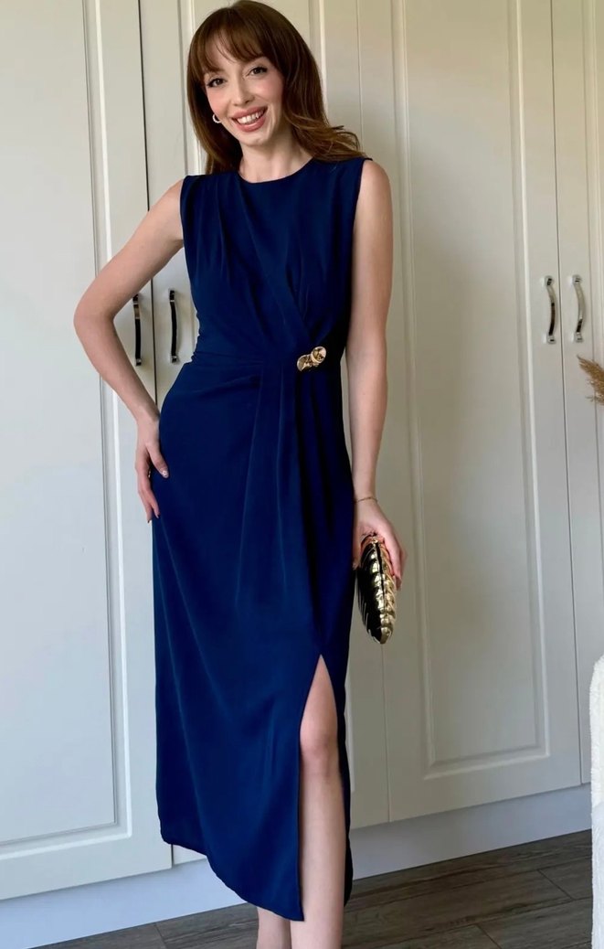 Lacivert, kolsuz, drapeli midi elbise, v yaka ve dar kesimle ofis için çağdaş bir stil sunar. 1 kere kullanıldı fotoğraftakiyle aynı elbise ama tokası yoktur