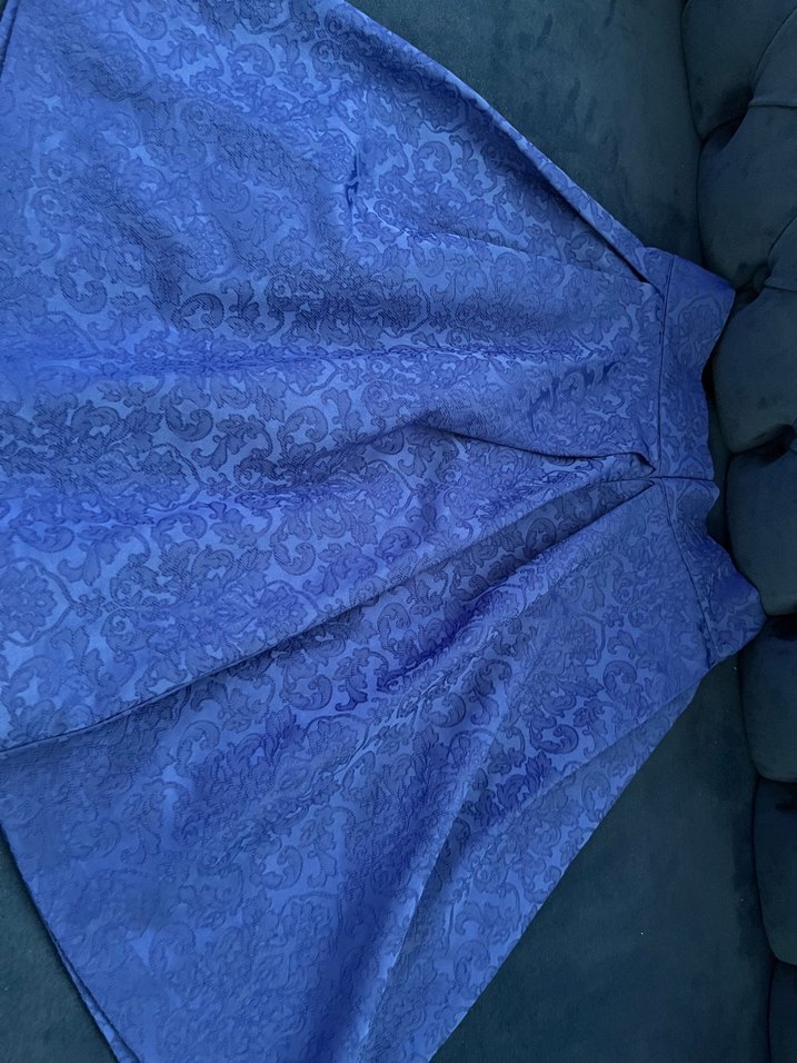 Lacivert, parlak ve saten dokulu kumaştan, vintage desenli, bol kesim drapeli midi etek, düğünler için uygun. ✨