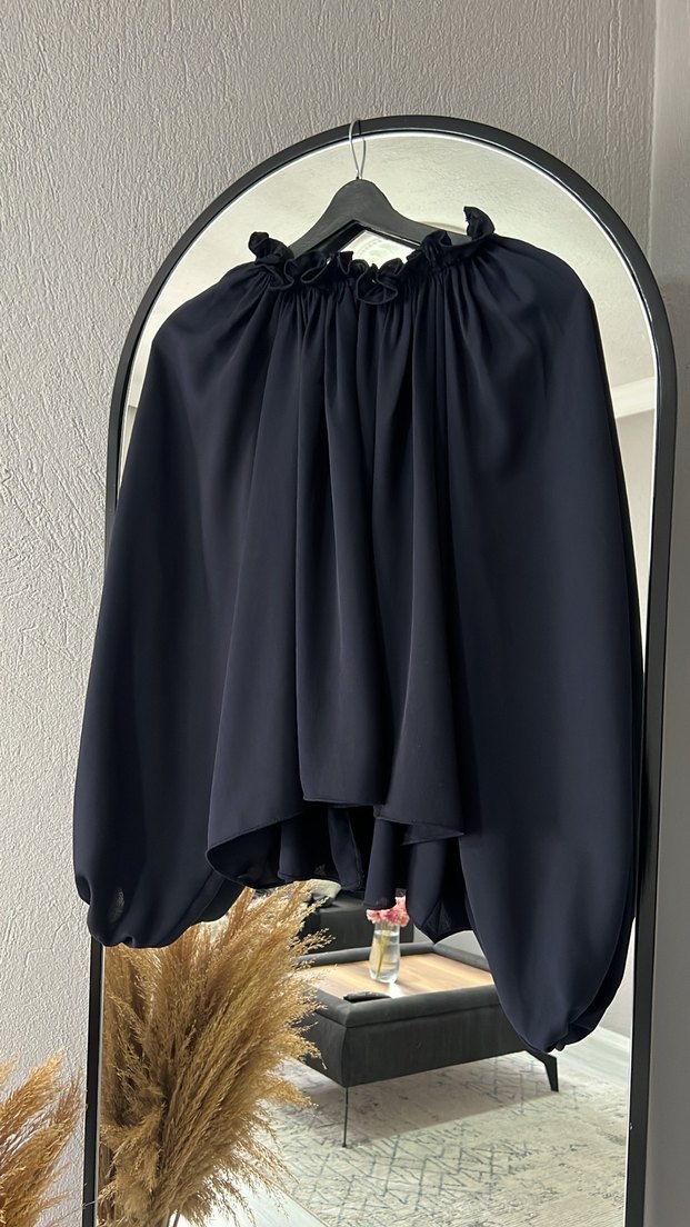 Lacivert renkli, drapeli ve bol kesim mini bluz. Yüksek yakalı, uzun kollu ve desensiz tasarıma sahip. Sentetik yumuşak kumaştan üretilmiştir.