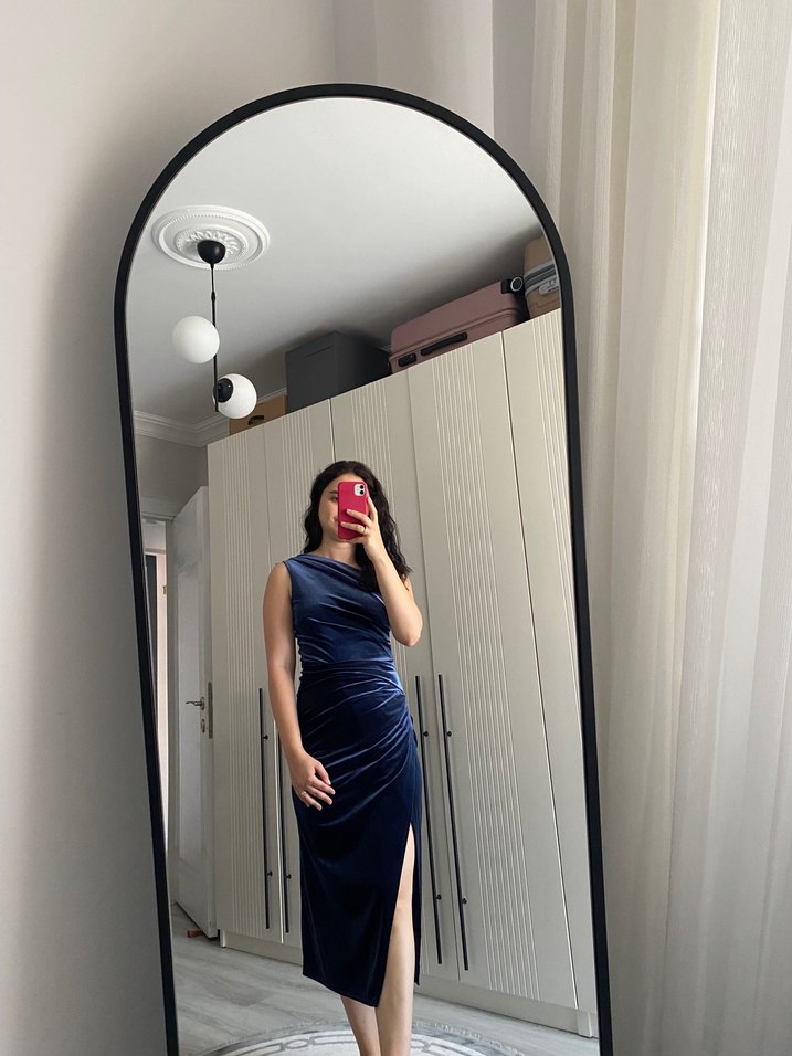 Lacivert, kolsuz, drapeli ve vücuda oturan midi elbise. Kadife kumaşı ve yırtmaç detayı ile gösterişli bir tasarım. Romantik akşamlar için ideal.