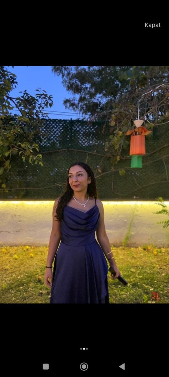Lacivert, straplez ve drapeli tasarıma sahip, midi uzunlukta, vücuda oturan bir elbisedir. Minimalist gotik tarzıyla düğün ve mezuniyet için uygundur.