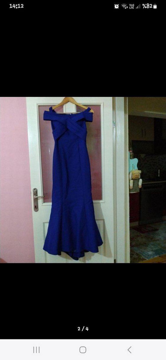 Lacivert, straplez uzun abiye elbise, drapeli detaylarla vücuda oturan kesime sahiptir. Kolsuz ve çağdaş tarzda, minimal düğünler için uygundur.