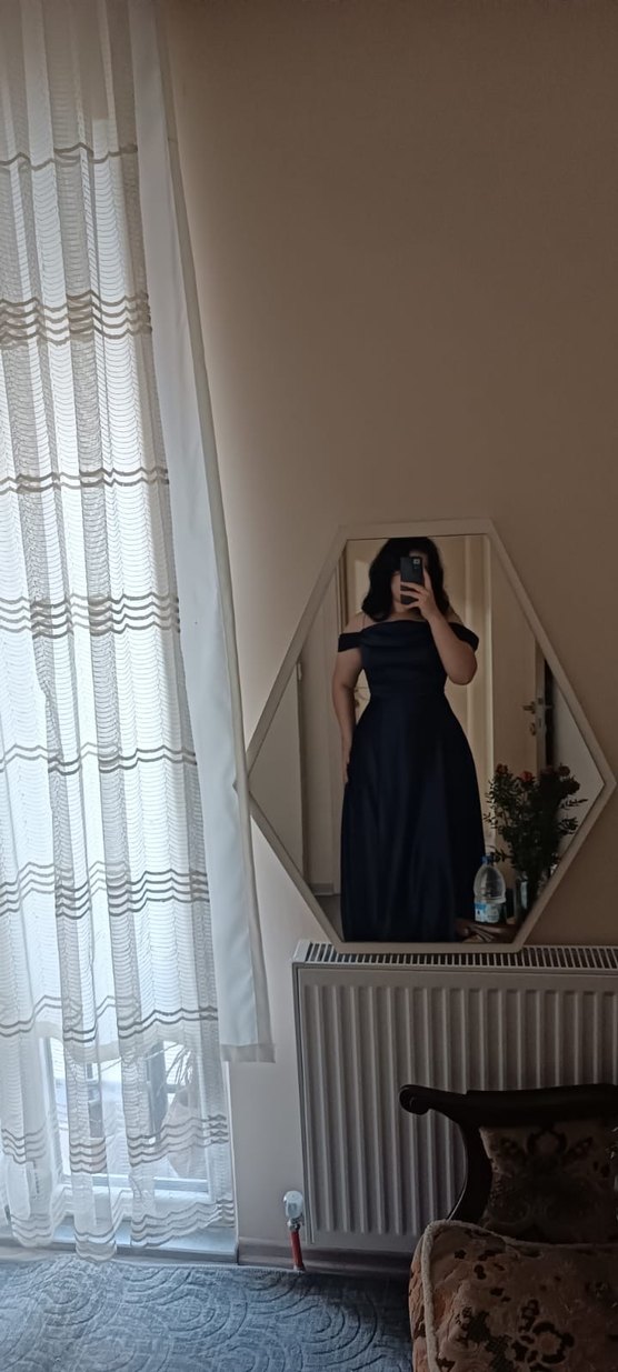 Lacivert, drapeli ve straplez yakalı, uzun ve vücuda oturan elbise manken boyu 175 beden 42