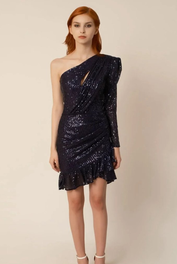 Lacivert mini abiye, drapeli tasarımı ve tek kollu kesimiyle dikkat çeker. Vücuda oturan kesimi ve yılan desenli kumaşı cesur ve gösterişli bir hava sunar. ✨