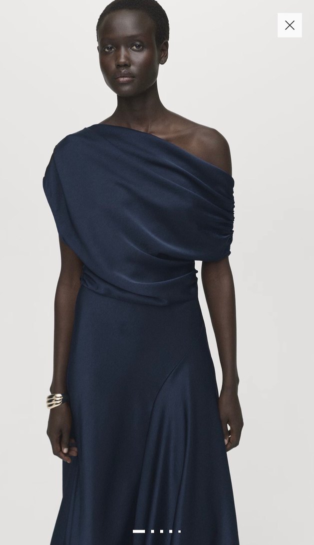 Lacivert uzun elbise, drapeli tek omuz kesimi ve kolsuz, rahat kesimiyle ipeksi kumaştan romantik akşamlar için uygundur. Hiçbir sorunu yoktur.