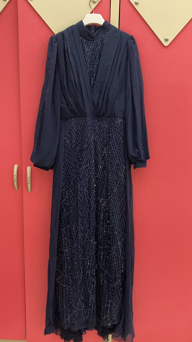 Lacivert renkte, yüksek yakalı ve uzun kollu, drapeli detaylara sahip bol kesim uzun abiye elbise. Düğün ve özel davetlere uygun şık tasarım.