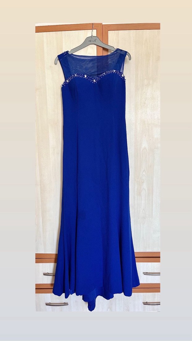 Lacivert uzun abiye elbise, drapeli tasarımı, V yakası ve kolsuz kesimiyle modern klasik görünüm sunar, parlak dokusuyla düğünler için uygundur. Ön etek kısmında hafif çıkmayan fazla belli olmayan leke vardır çok belli olmuyor ancak dikkatli bakınca fotoğrafta görebilirsiniz arka etek kısmı terzi işlemi gördü