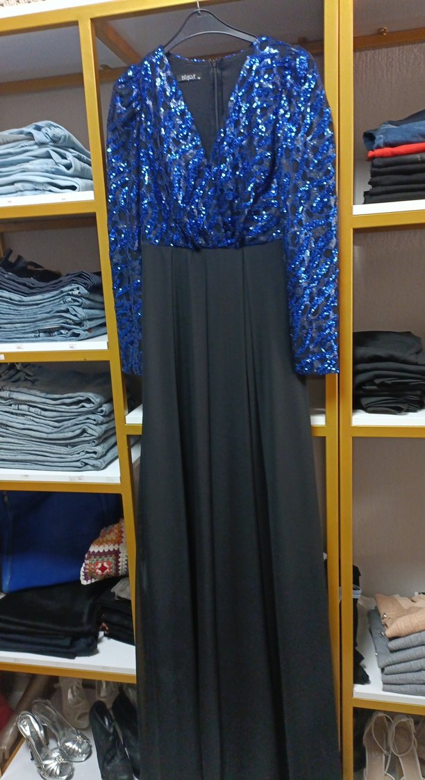 Uzun, lacivert payetli drapeli üst kısmı V yaka ve uzun kollu, bol siyah etekli abiye elbise. Gösterişli partiler için uygun. ✨