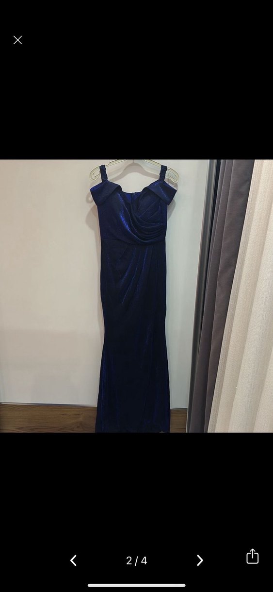 Lacivert renk, drapeli ve straplez kesim uzun abiye elbise, düğün ve özel davetler için uygun, klasik ve modern tarzda.