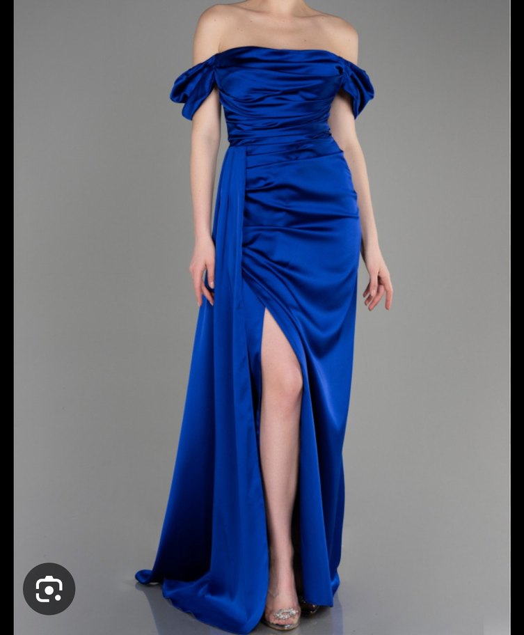 Lacivert renkte, drapeli ve kayık yaka uzun abiye elbise. Omuzları açık, ince askılı, parlak kumaş ve yüksek yırtmaçlı klasik şıklık sunar.