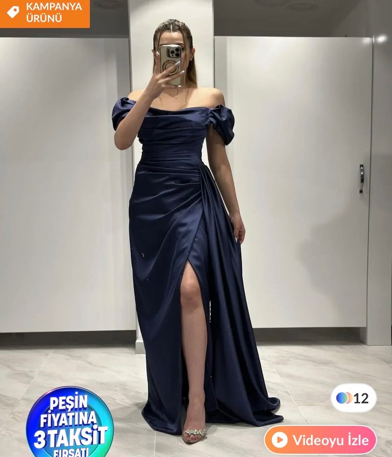 Lacivert, askılı kollu, straplez, drapeli ve vücuda oturan uzun abiye elbise. Parlak kumaşı, yırtmaç detayı ve modern klasik tarzıyla düğün için uygun.