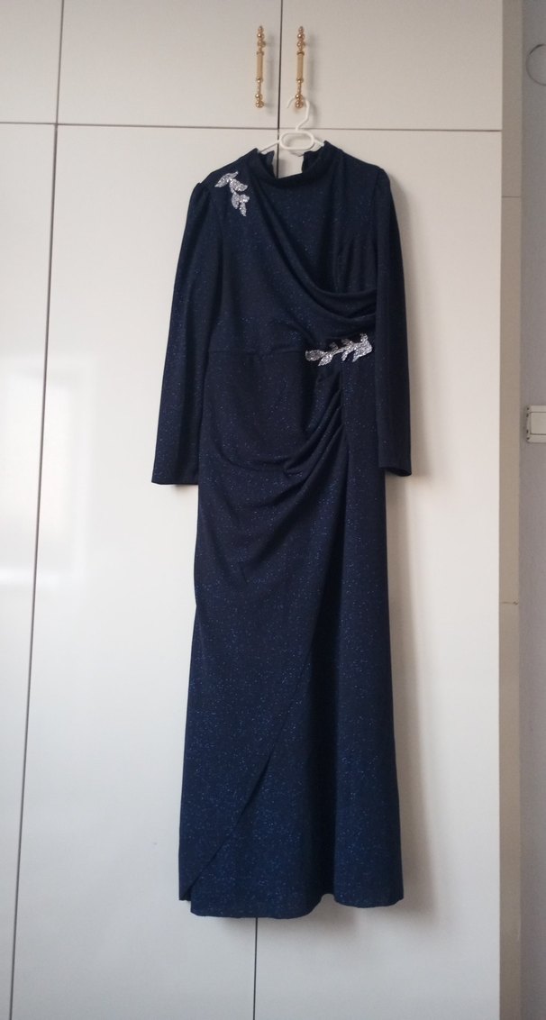 Lacivert renkte, yüksek yakalı ve uzun kollu, drapeli tasarıma sahip, zarif detaylarla süslenmiş uzun abiye elbise. bir defa giymişim tertemiz gönül rahatlığıyla kullanın