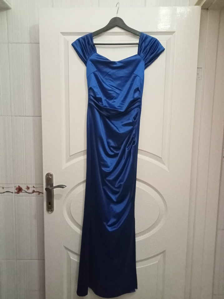 Lacivert renkte, drapeli ve uzun kesimli abiye elbise. Kayık yaka ve kolsuz modeli ile modern klasik şıklık sunar. Parlak kumaşı minimalist bir zarafet katar.