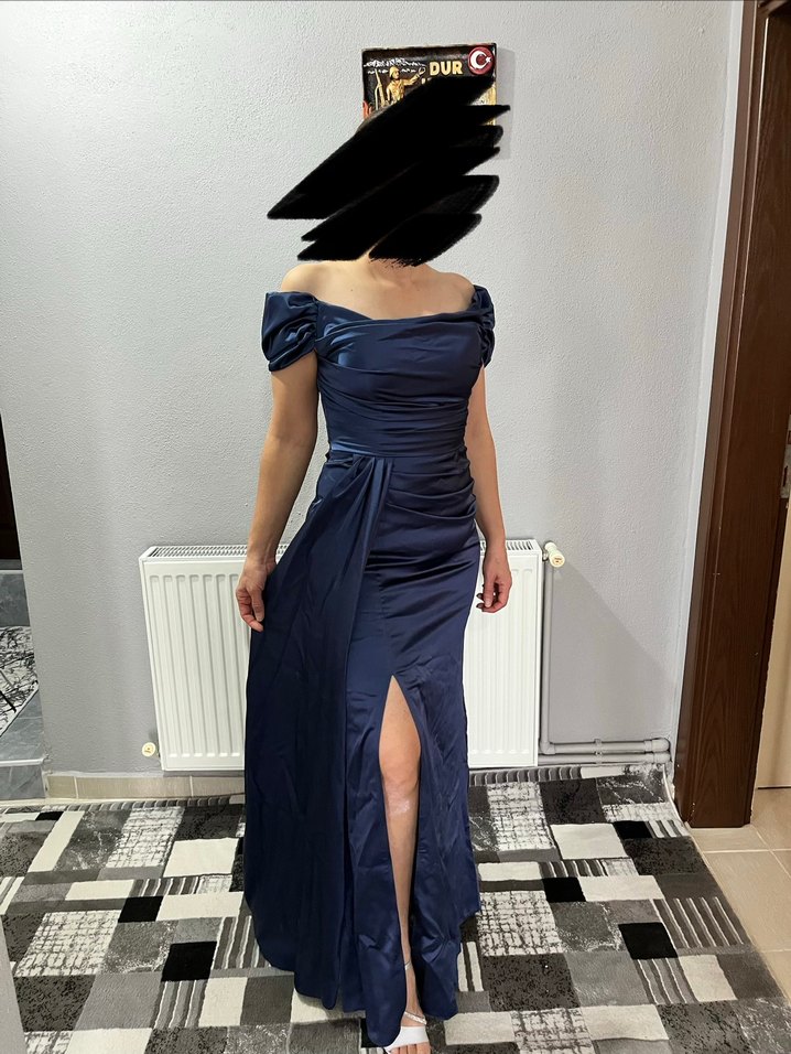 Lacivert Drapeli Uzun Abiye Elbise