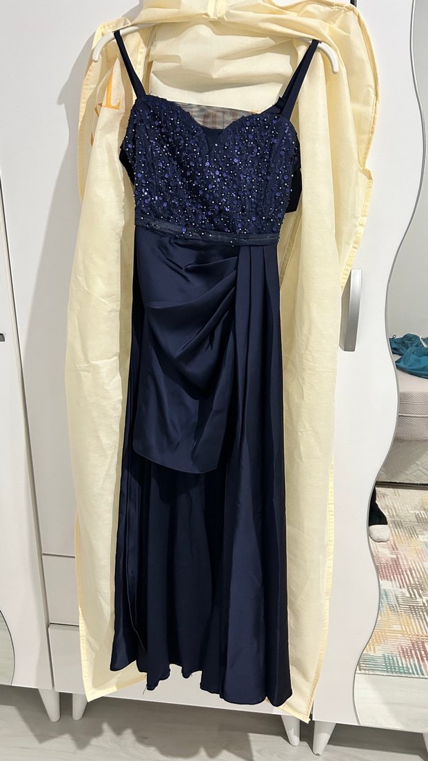Lacivert Drapeli Uzun Abiye Elbise