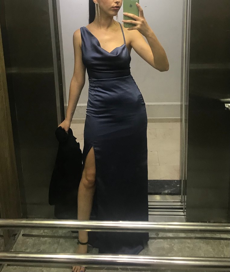 Lacivert uzun abiye elbise, v yaka drapeli ve ince askılıdır. Beden oturur, yırtmaç detaylı, romantik akşamlar için uygundur.
