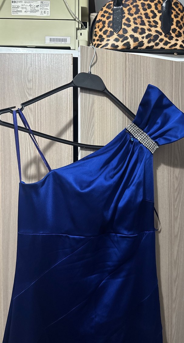 Lacivert, parlak kumaştan drapeli, uzun ve kolsuz, tekne yaka, klasik kesim abiye elbise. 38-40 beden uyumlu bir kere bile giyilmedi.
