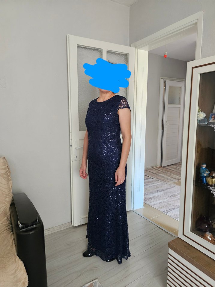 Lacivert renkli, drapeli ve bisiklet yaka uzun abiye elbise. 44 beden bir kere giyildi tadilat yok.