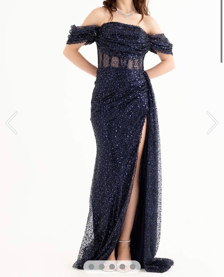 Lacivert uzun abiye elbise, oturan kesim ve drapeli detaylara sahiptir. Kayık yaka, askılı kısa kollu ve bacak dekolteli, romantik akşamlar için uygundur. Klasik ve çağdaş tarzda, desensizdir. Sadece yırtmacında tadilat var 2saat giyildi