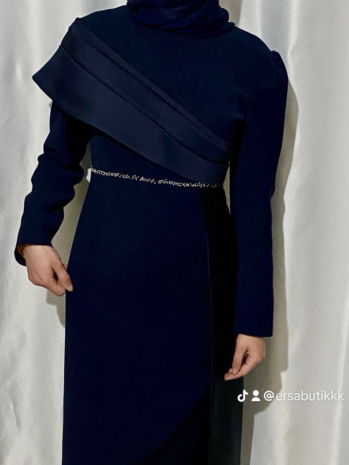 Lacivert renkte, yüksek yakalı ve drapeli detaylı uzun abiye elbise. Düzenli kesim ve askılı kollara sahip, modern ve sade tasarım. Ofis için uygun. Hiçbir sorunu yoktur, sadece bir kez giyildi ✨