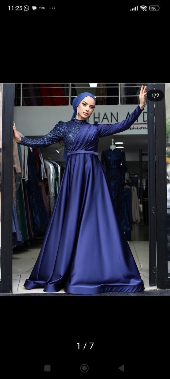 Lacivert uzun abiye, yüksek yaka ve uzun kollu, parlak baskılı kumaş ve drapeli tasarıma sahip, düğünler için uygun klasik kesim elbise. Sadece bir kere giyindim kızımın nikahında