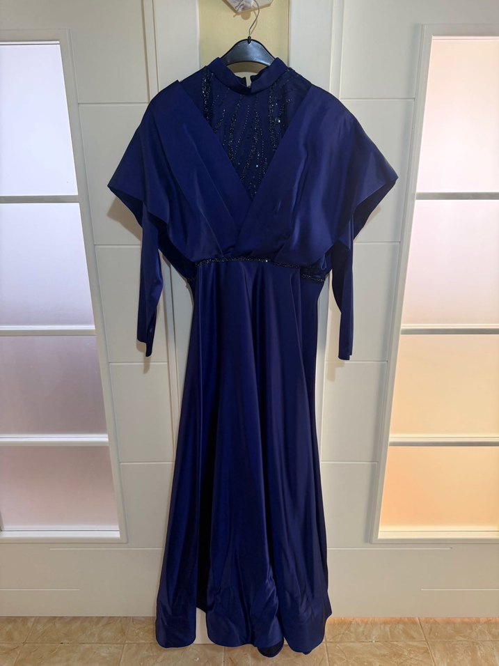 Lacivert uzun abiye elbise, drapeli tasarıma sahip, V yaka ve uzun kolludur. Bol kesim ve modern klasik stilde olup, düğün için uygundur. Desensiz, klasik zarafeti avant-garde dokunuşla sunar. Özel dikimdir ölçü için mesaj atınız