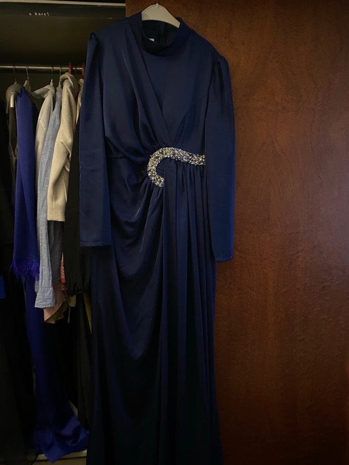 Lacivert uzun abiye elbise, yüksek yakalı ve uzun kollu, drapeli tasarım ve belde taşlı detayla modern klasik görünüm sunar.