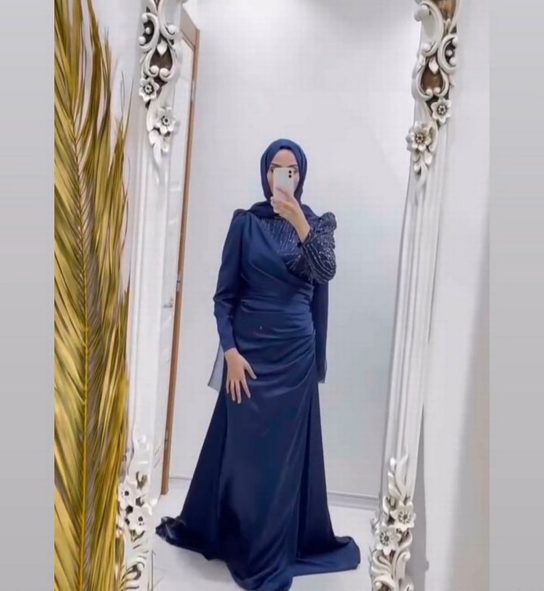 Lacivert, uzun boy, drapeli, yüksek yakalı ve uzun kollu abiye elbise. Düzenli kesim, sade ve şık, düğün için uygun. k. ı. r. a. l. ı. k. t. ı. r 40 beden uyumlu şal dahildir