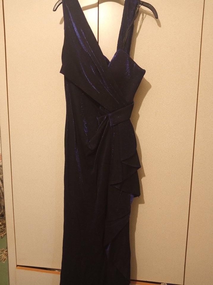 Lacivert renkte, V yaka ve kolsuz, drapeli detaylara sahip, klasik ve şık uzun abiye elbise. Parti için uygun, fit kesim.